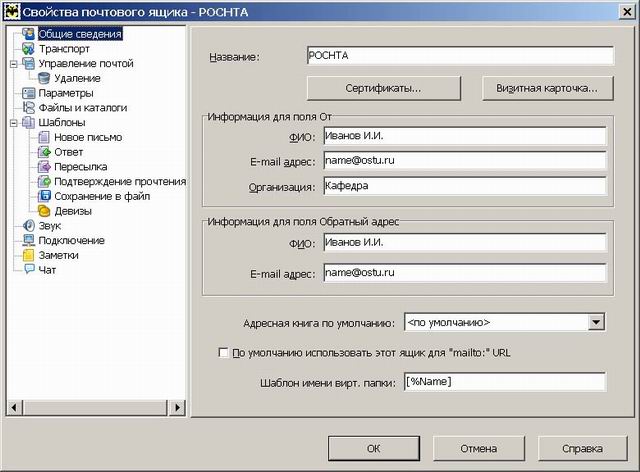 3. На закладке "Транспорт" обязательно заполните следующие поля: SMTP-сервер: mail.ostu.ru Почтовый сервер: mail.ostu.ru Пользователь: имя Вашего почтового адреса до знака "@" (для ящика name@ostu.ru - name) Пароль: Ваш пароль к почтовому ящику на сервере ostu.ru.