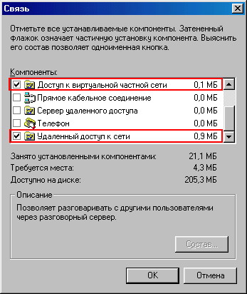 3. Включите в список компонентов Доступ к виртуальной частной сети и Удаленный доступ к сети