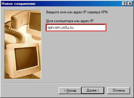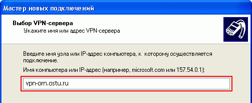6. В поле Имя компьютера или адрес IP наберите vpn-orn.ostu.ru