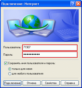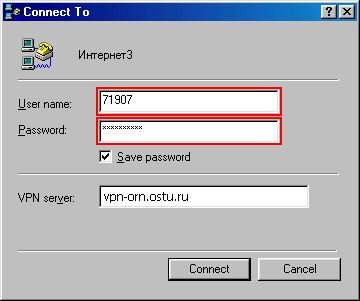 6. В появившимся окне подключения в поле Имя пользователя введите номер вашей карты, в поле пароль - ПИН-КОД карты. (Примечание: Для того, чтобы каждый раз перед подключением не вводить ПИН-КОД, установите флажок Сохранить имя пользователя и пароль)