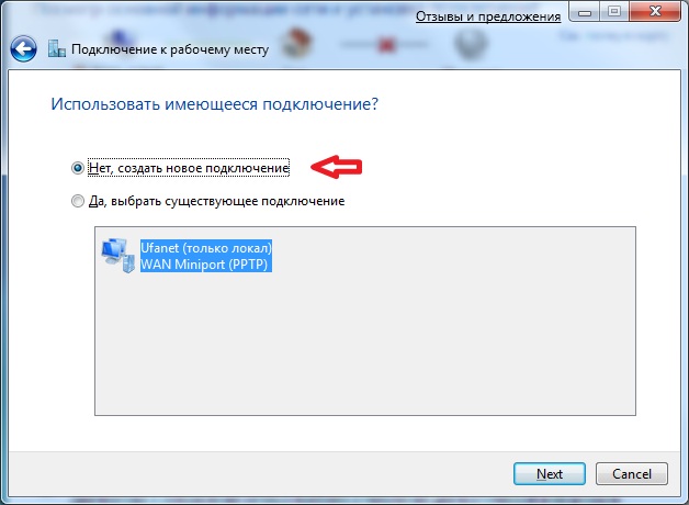 6. На вопрос системы "Использовать существующее подключение?" ответьте Нет, создать новое подключение