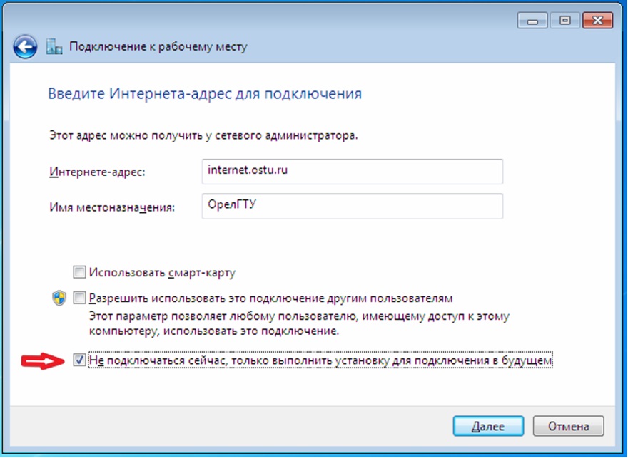 9. Введите адрес VPN-сервера (internet.ostu.ru) и название для подключения (например, ОрелГТУ)